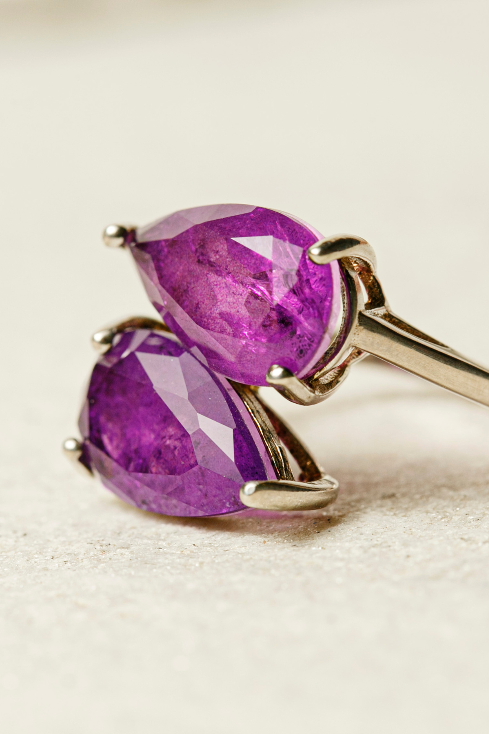 Anel feito de Prata 925 com duas gotas da pedra Ametista 9x15mm.