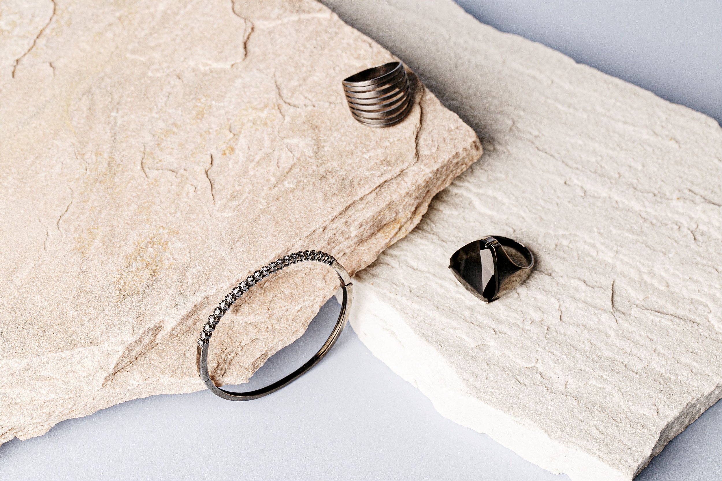Anel finamente banhado a ródio negro com um estilo de acabamento fosco.