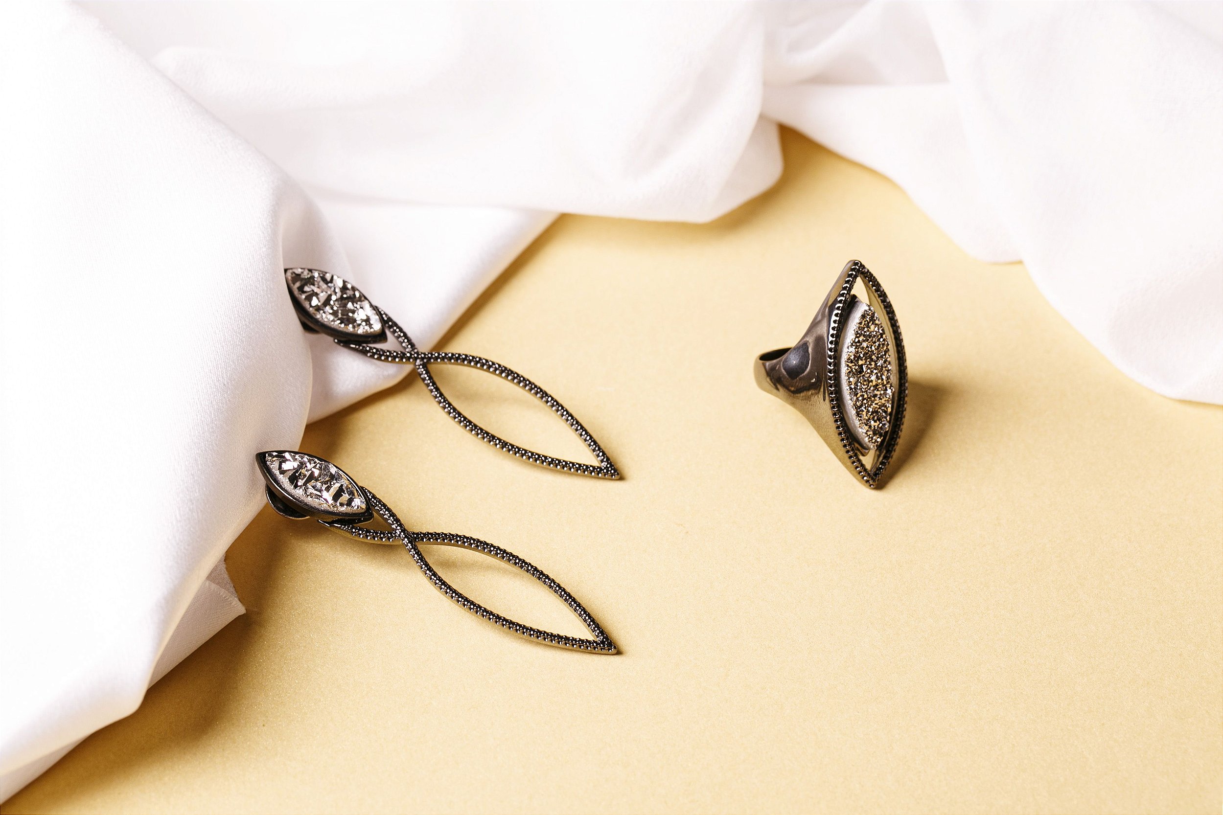 Anel lindíssimo em ródio negro com Drusa prateada em formato olho e detalhe ao redor com Microcravações de Hematita.