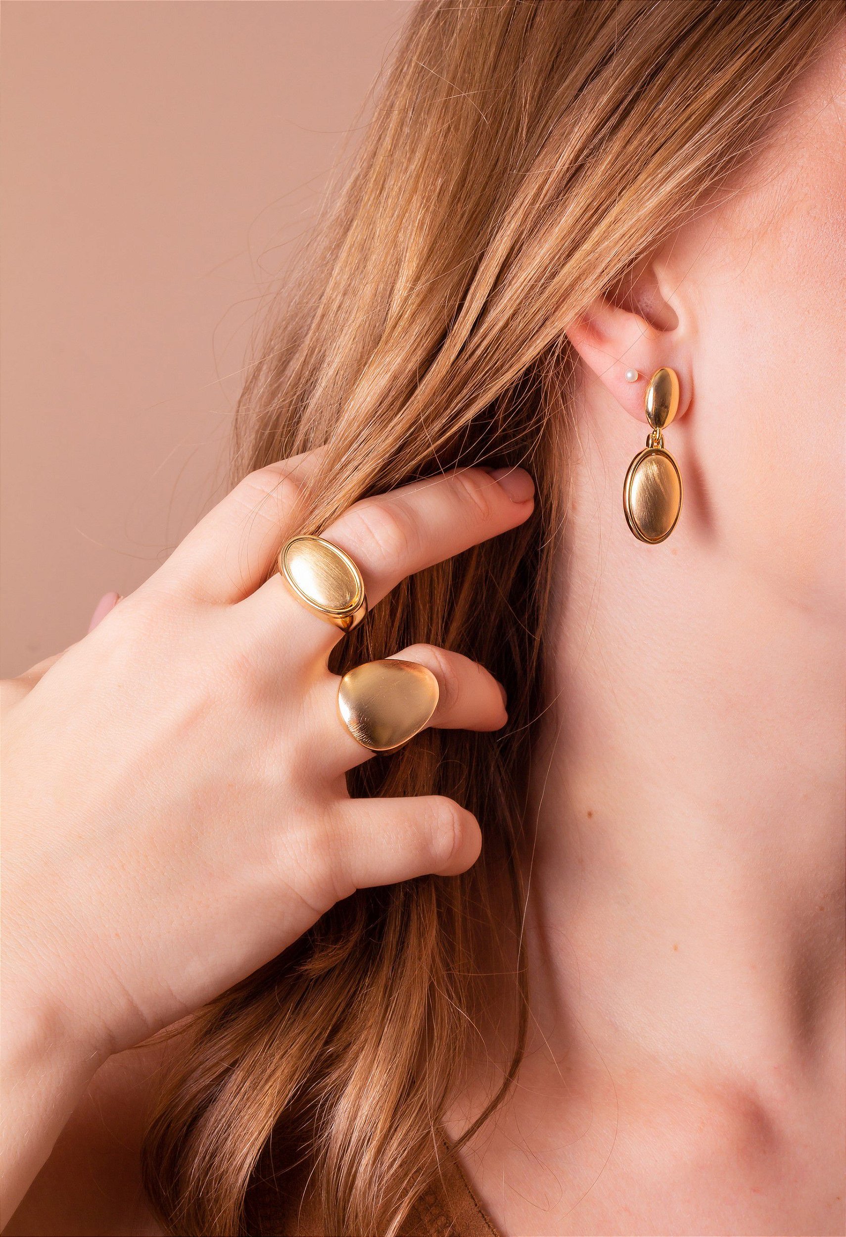 Anel folheado a Ouro 18k com acabamento do tipo fosco e formato oval.
