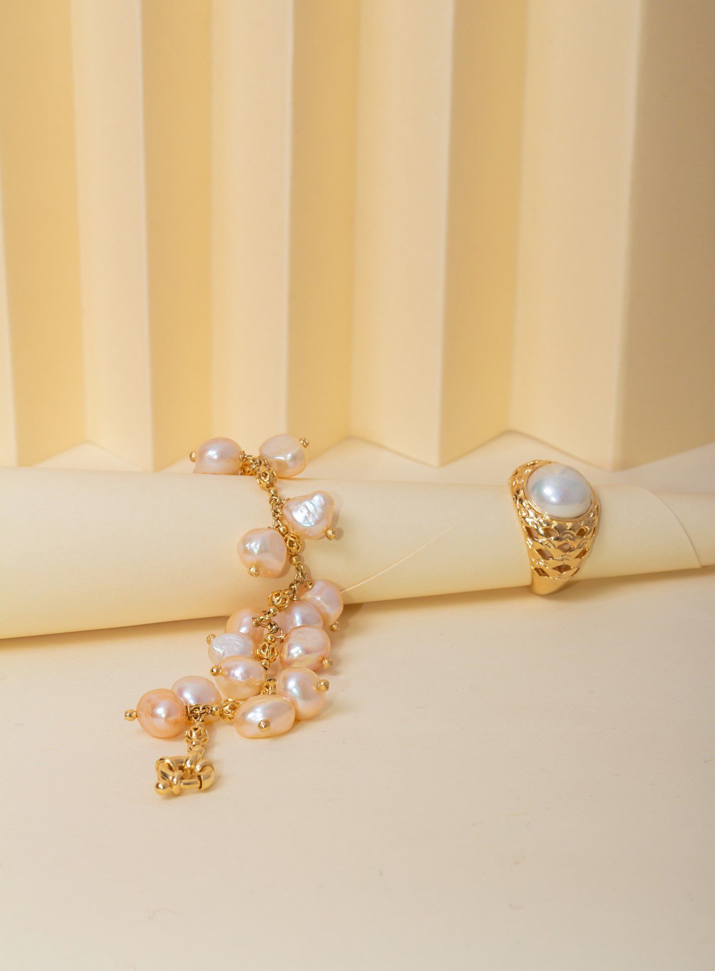 Anel finamente banhado a Ouro 18k com um trabalhado meio vazado em sua base e uma meia esfera de Pérola de 12mm de diâmetro bem central.