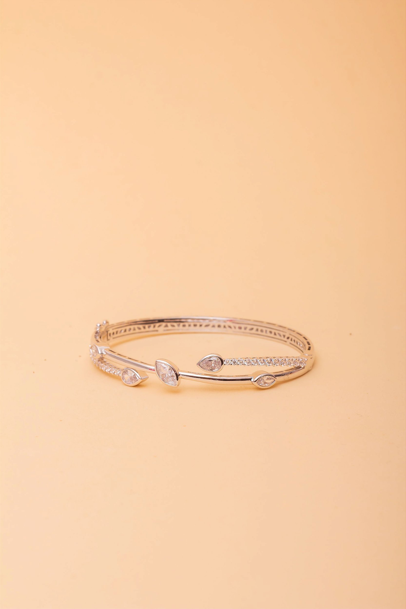 Bracelete finamente banhado a Ródio Branco com Zircônias em formato remetendo a folhas de uma árvore e gotas em Zircônias alem de duas faixas de Microzircônias.
