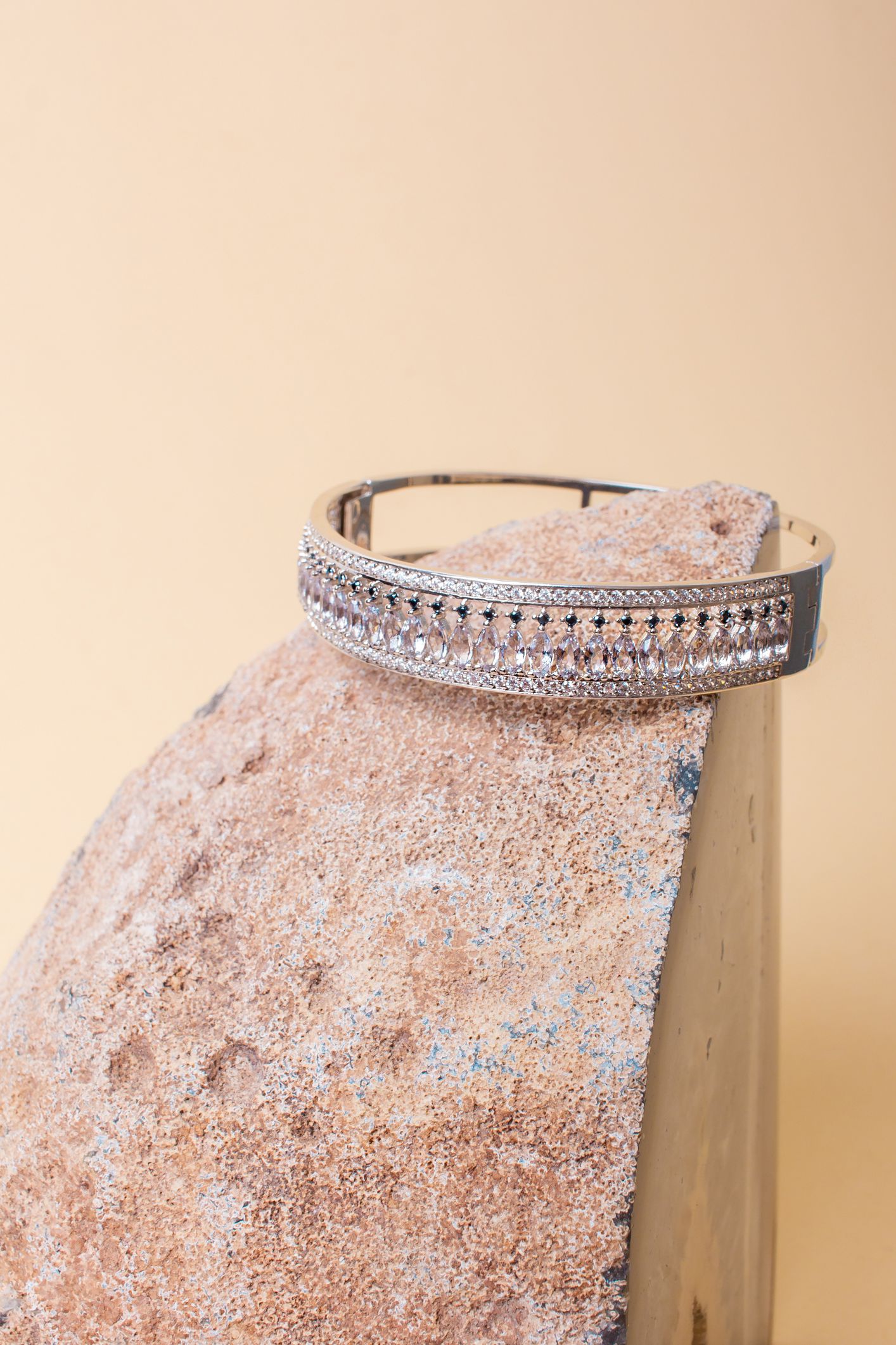 Bracelete finamente banhado a Ródio Branco com detalhes mega brilhantes com Microzircônias, Zircônias em formato folha e, com muito mais charme, microcravações de Zircônias tom Azul Petróleo.