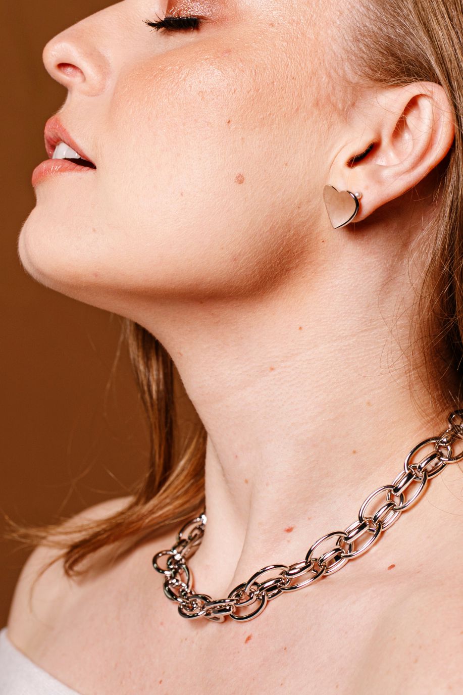 Brinco em formato de coração com um leve arredondamento, dando um charme.