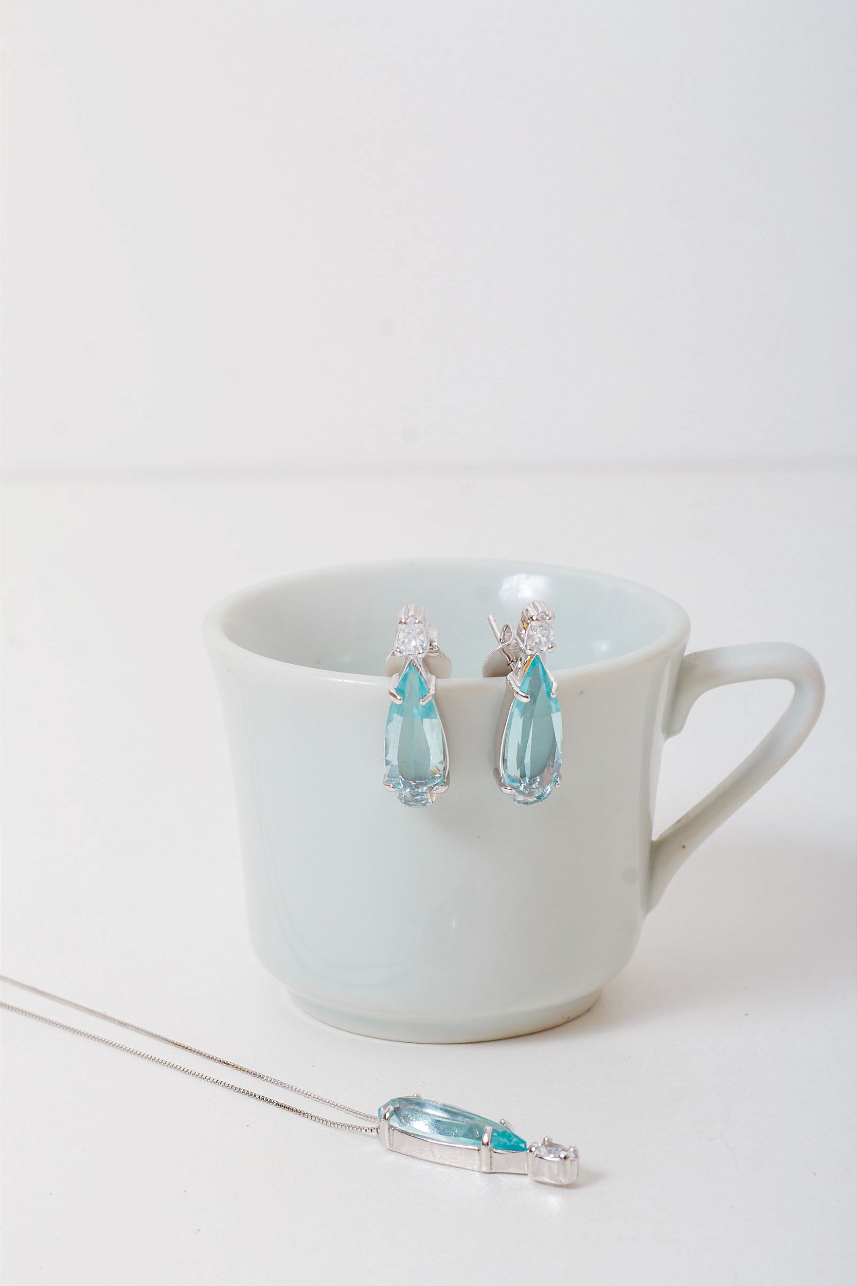 Brinco folheado a ródio branco com pequena Zircônia na base mais uma gota de Cristal Azul Límpido de 19x7mm.