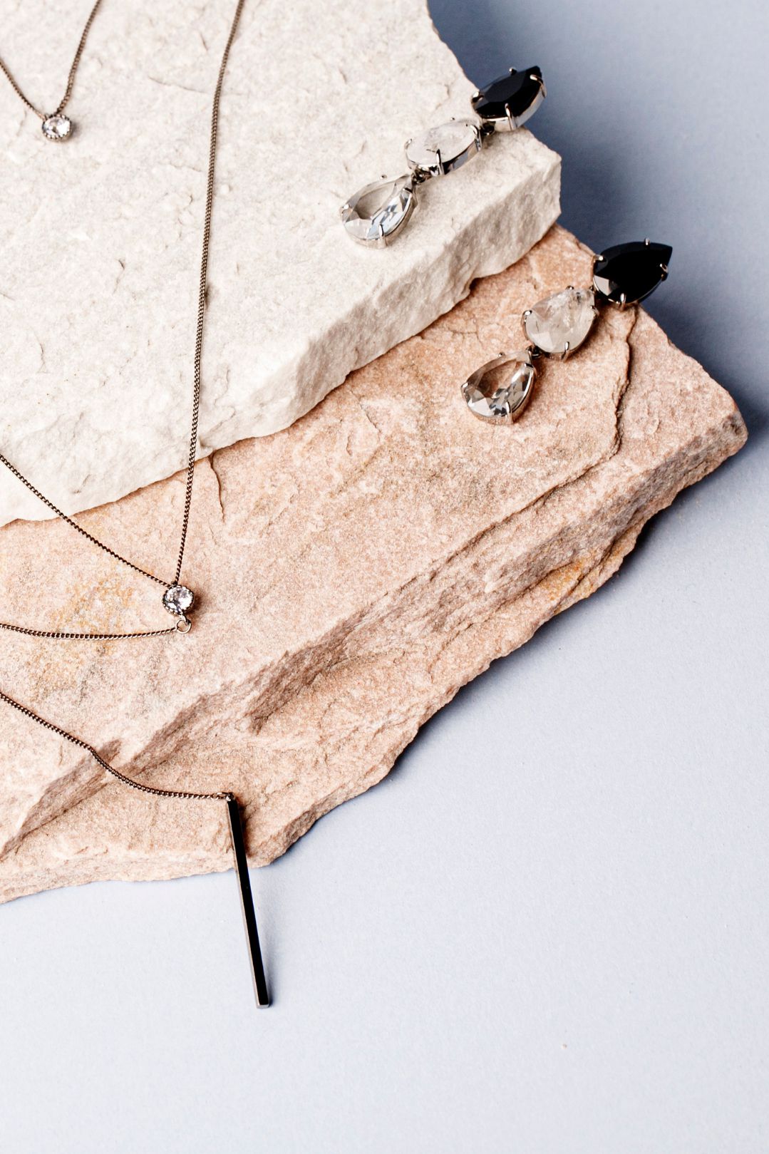 Lindo brinco finamente banhado a Ródio Negro. Com uma gota Cristal Ônix, outra Quartzo Rutilado e a última Cristal puro.