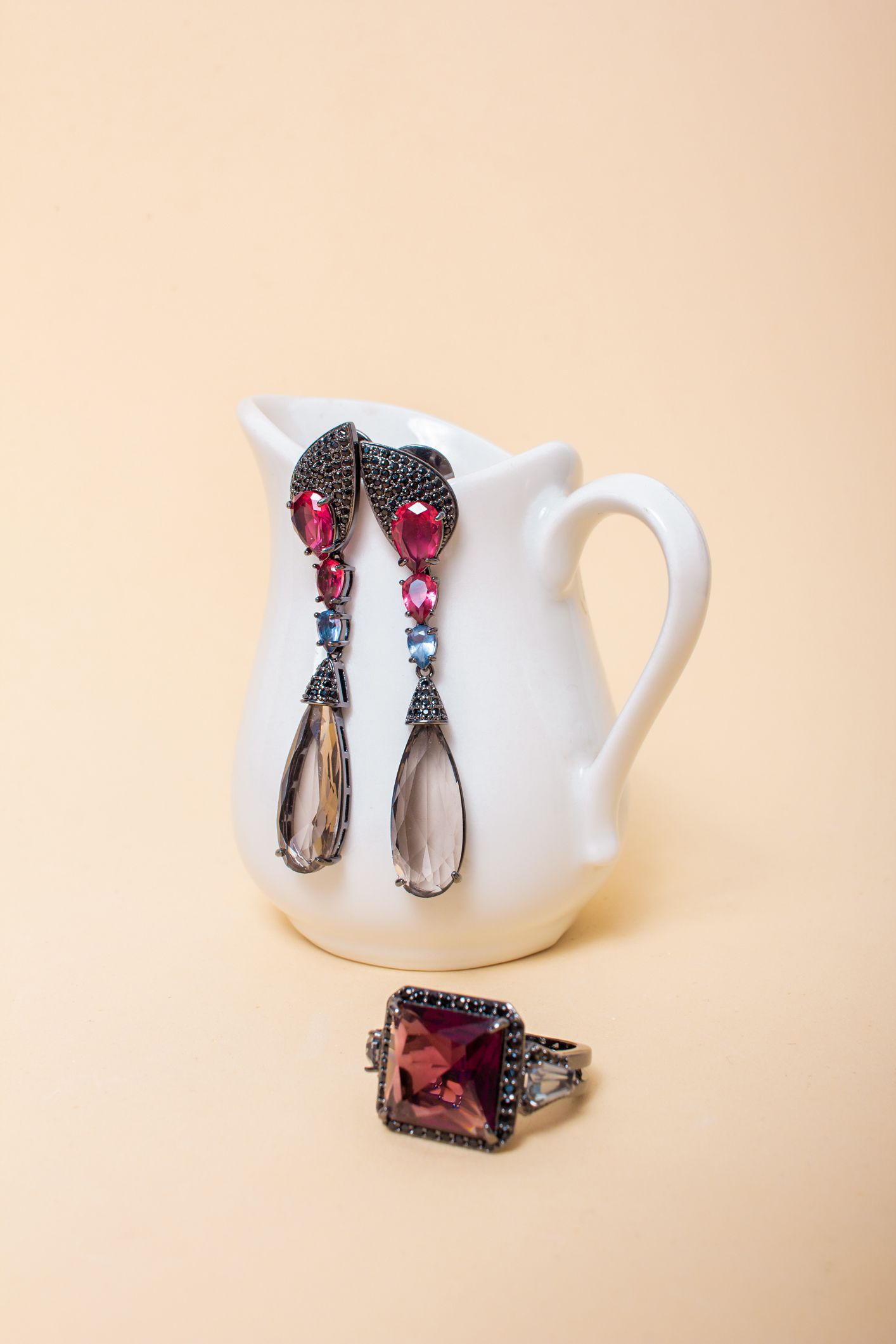 Brinco banhado a Ródio Negro com Cristais Carmesim, Fumê e Violeta facetados. Uma base em gota estilo gatinho cheia de Microzircônias Negras e mais um detalhe acima da gota Fumê também com Microzircônias Negras.