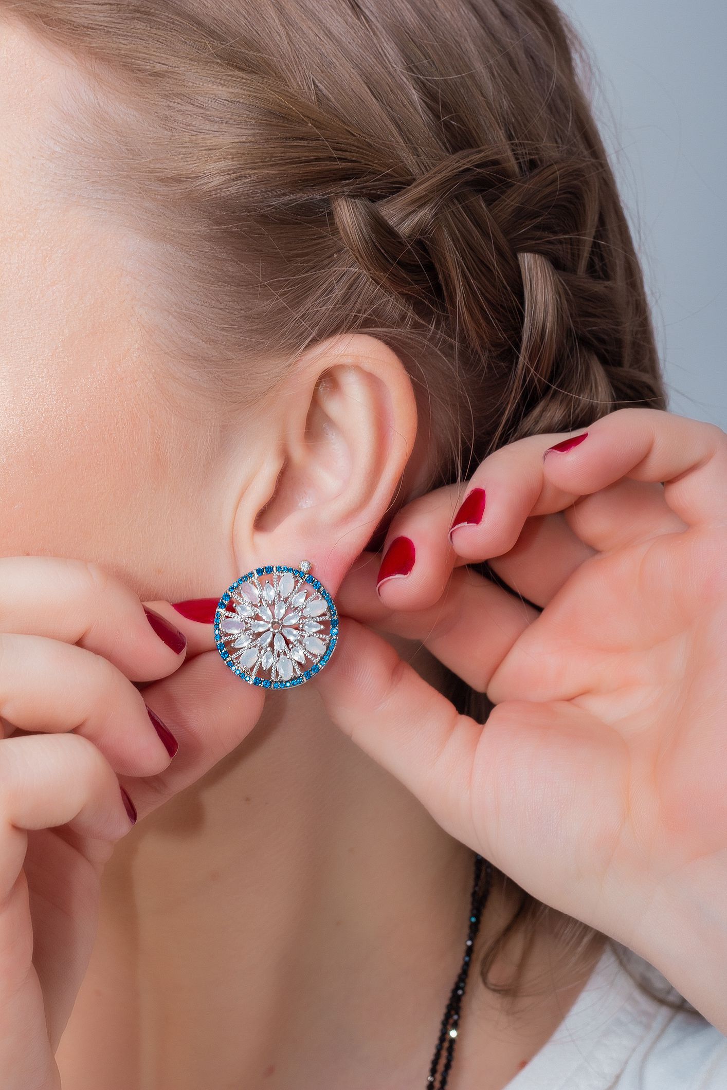 Brinco finamente banhado a Ródio Branco com Cristais Austríacos do tipo leitoso em formatos remetendo a uma flor e, além disso, uma fina linha na borda de Microzircônias em tons de Azul Marinho.