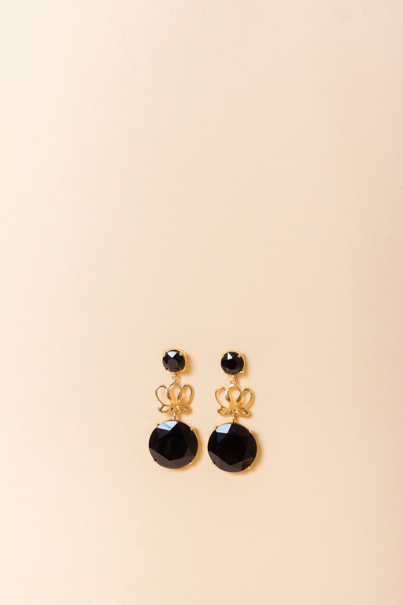 Brinco finamente banhado a Ouro18k com base circular de Ônix facetado 9mm, um detalhe em ouro em formato de Florr de Lótus e outra moeda de Ônix facetado de 20mm.