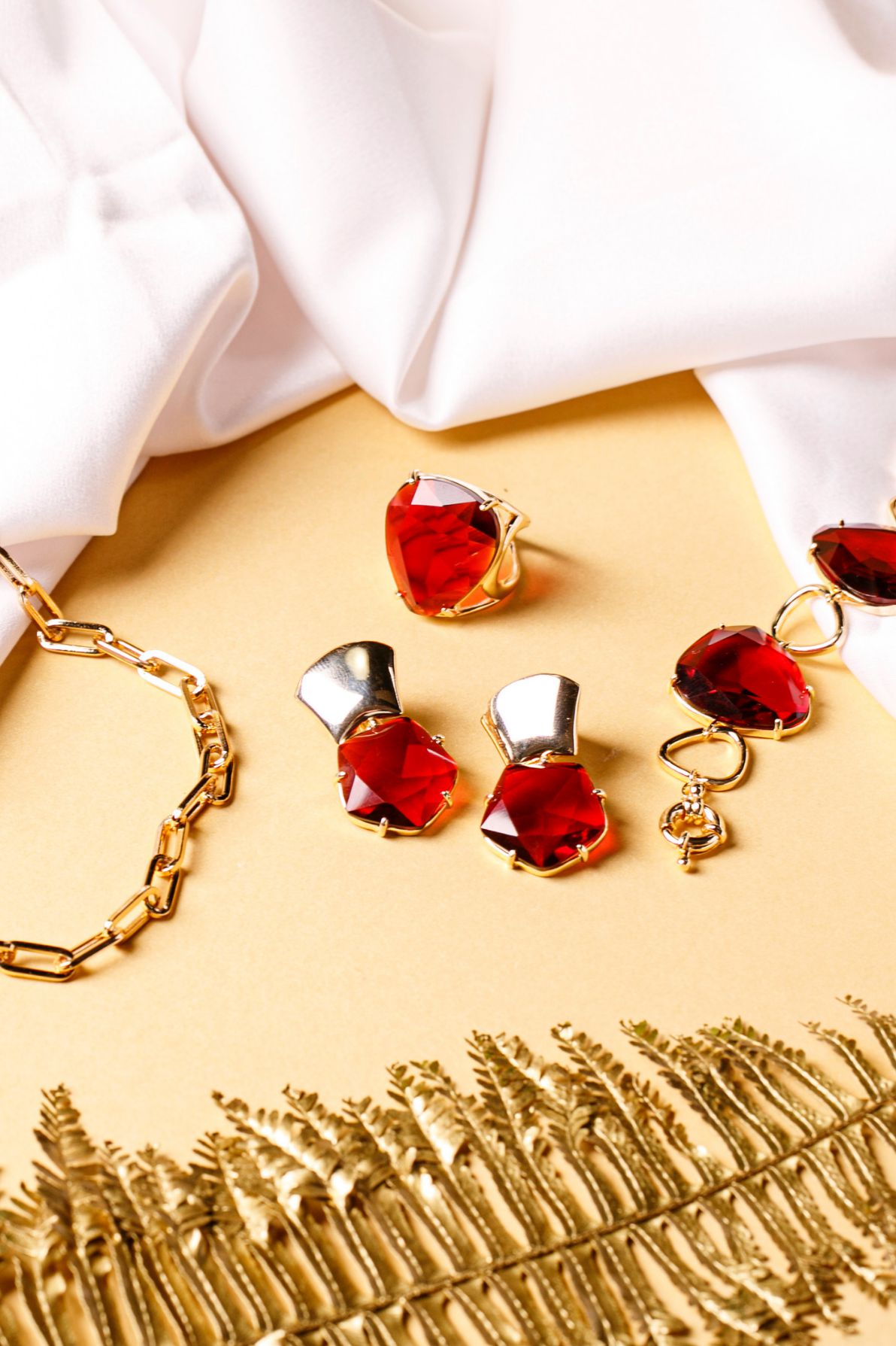 Brinco com base lisa em Ouro 18k com Cristal Vermelho Fogo em formato pentagonal, facetado.