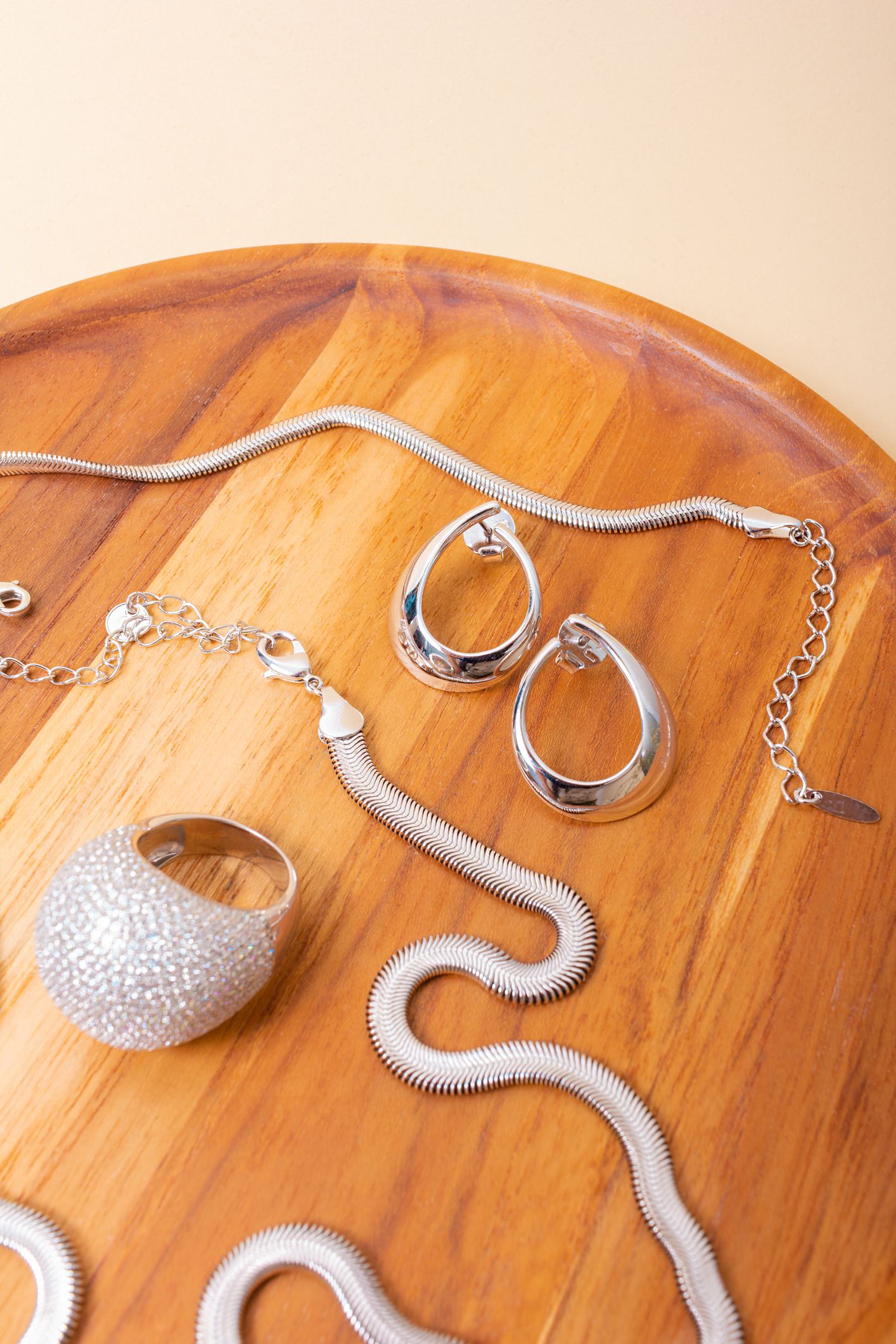 Brinco finamente banhado a Ródio com estilo de uma gota vazada.