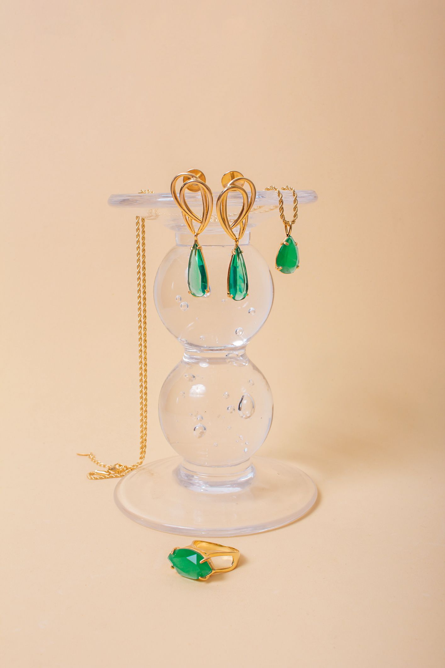 Brinco finamnete banhado a Ouro 18k com uma base em design dinâmico e uma gota fina de Cristal Verde Água facetado de 23x9mm.