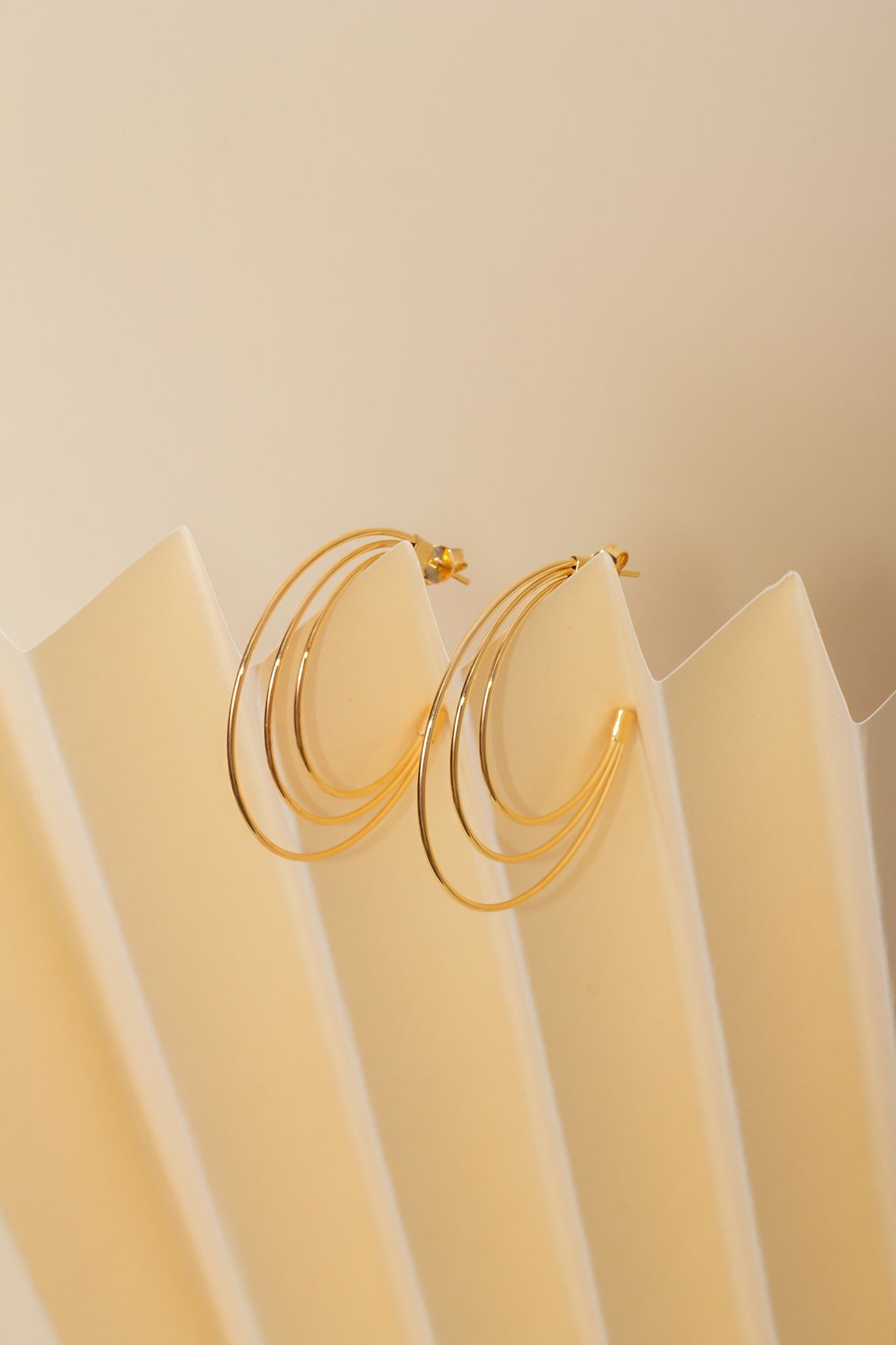 Brinco finamente banhado a Ouro 18k do tipo argola com tarracha, com 3 linhas de ouro ao longo do formato argola.