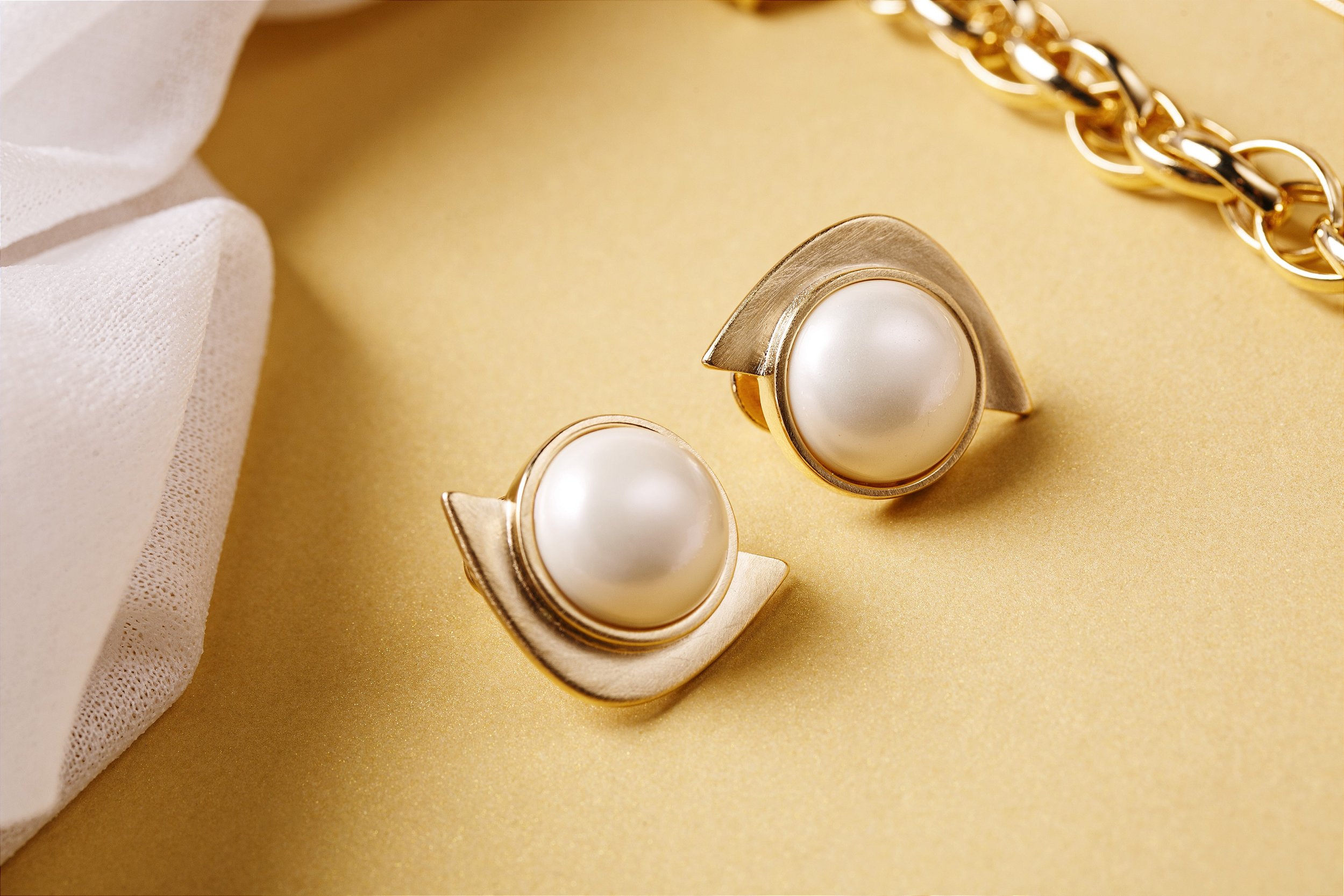 Lindo par de brincos em meia espera de Pérola com um detalhe abaixo em formato triangular com estilo riscado de acabamento.