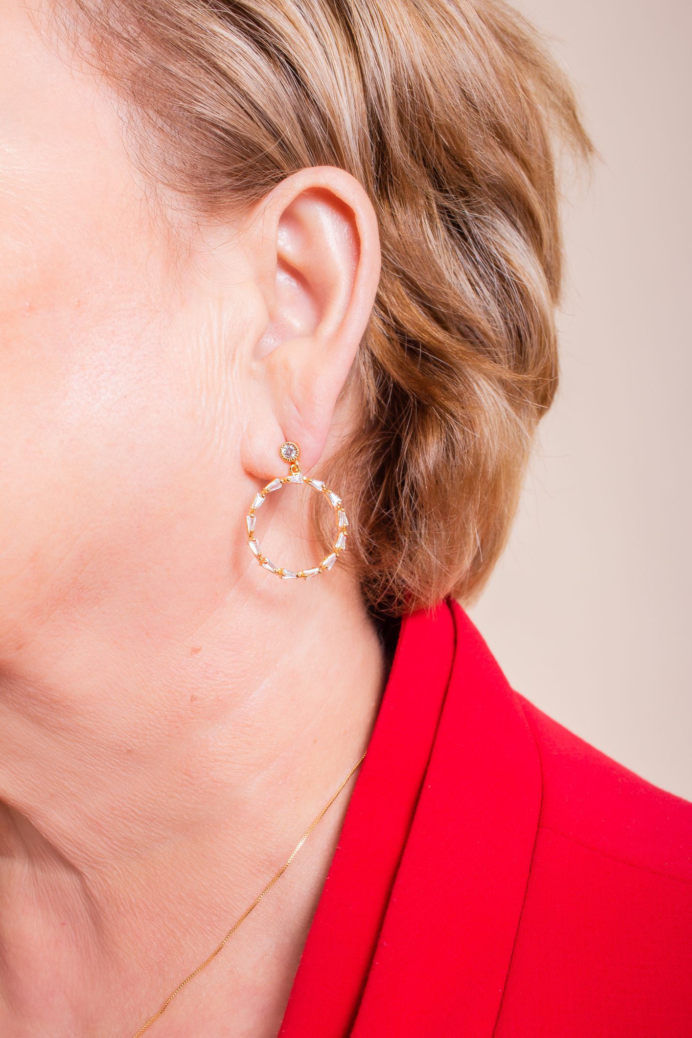 Brinco finamente banhado a ouro 18k com uma pequena Zircônia na base e, de pingente, uma roda de Zircônias em formato trapezoidal.