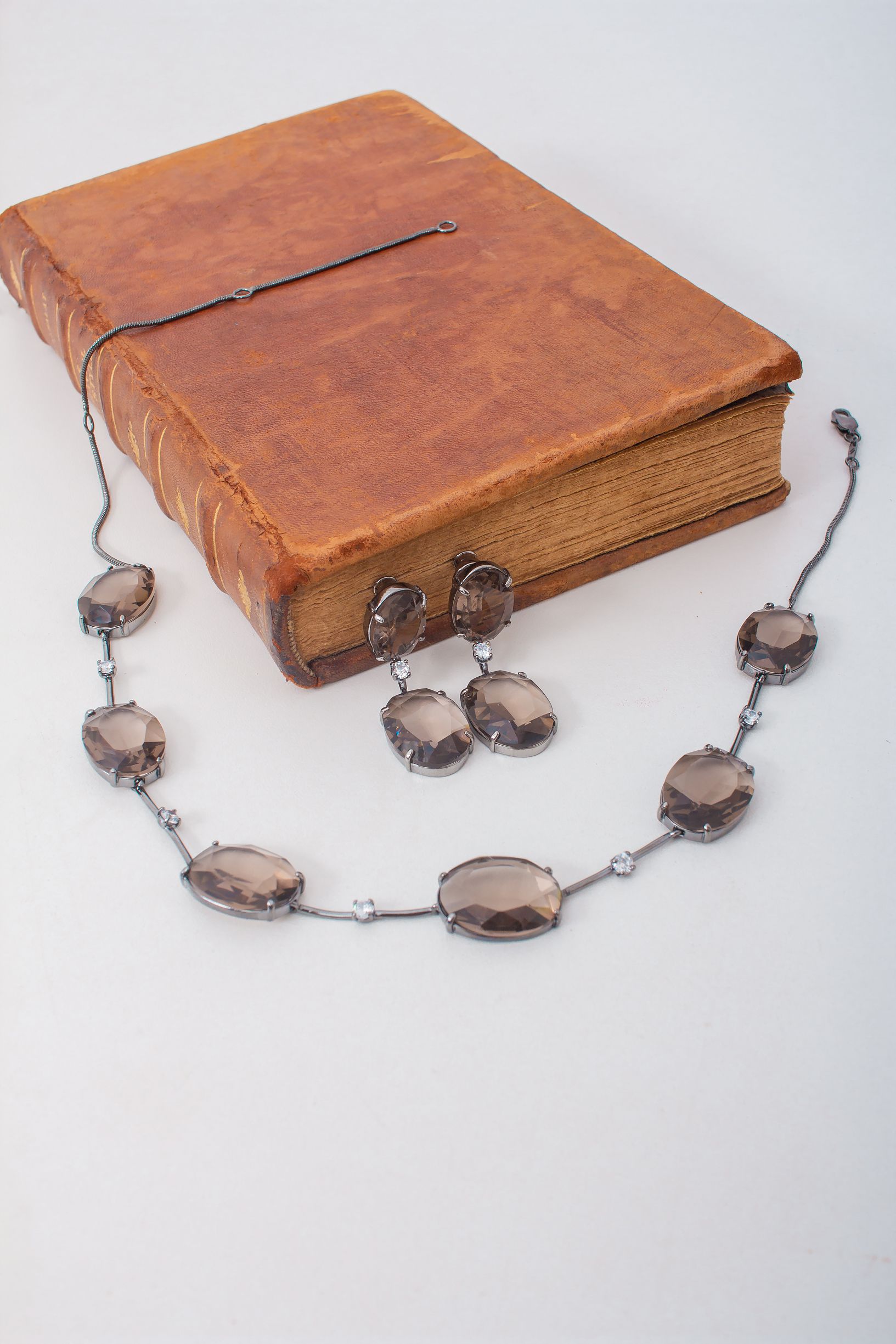 Brincos folheados a ródio negro com Cristal facetado oval de 19x25mm e Zircônia de 3mm intercalando os cristais.