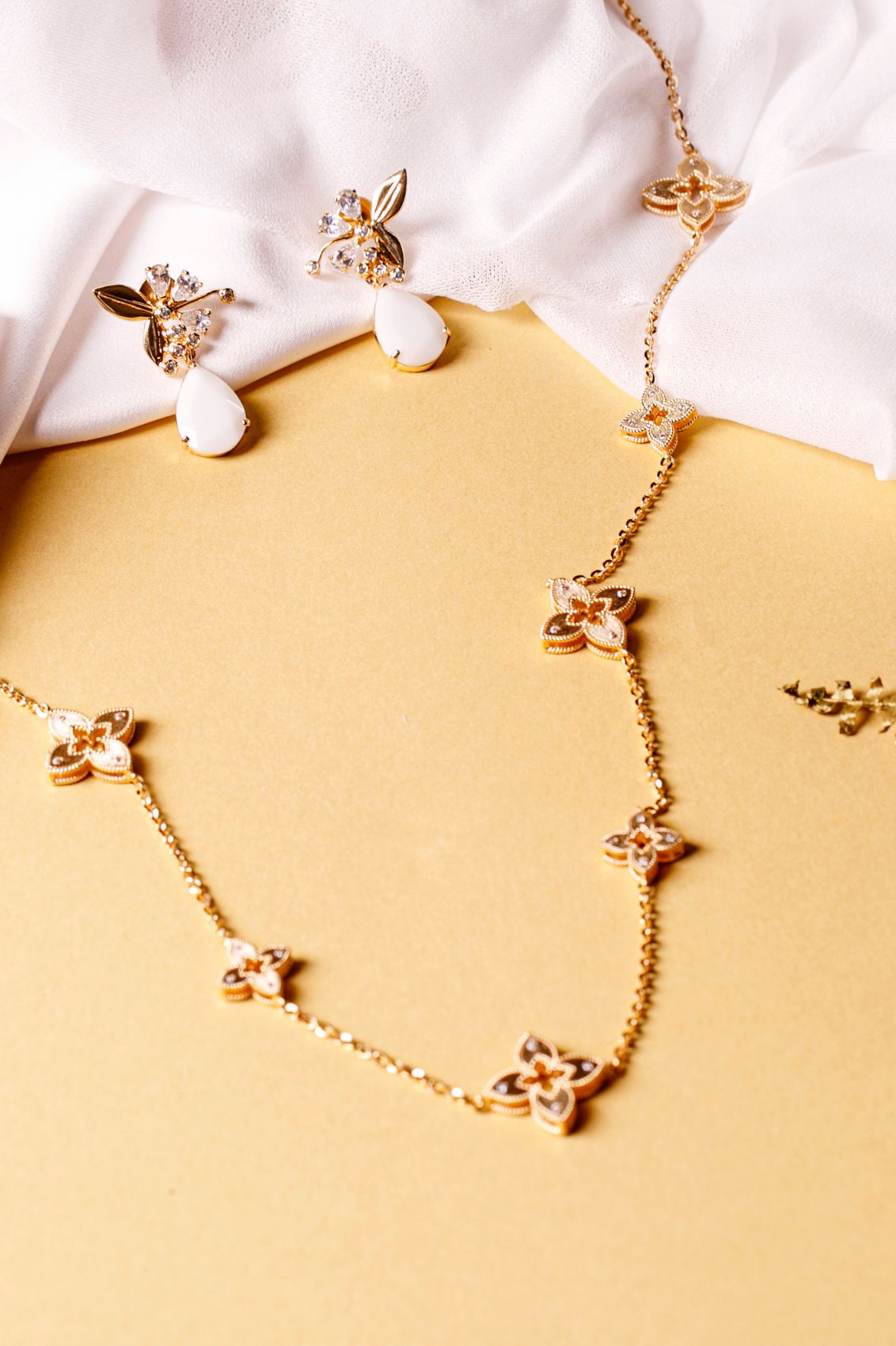 Gargantilha finamente banhada a ouro 18k com diversas flores ao longo do comprimento da corrente.