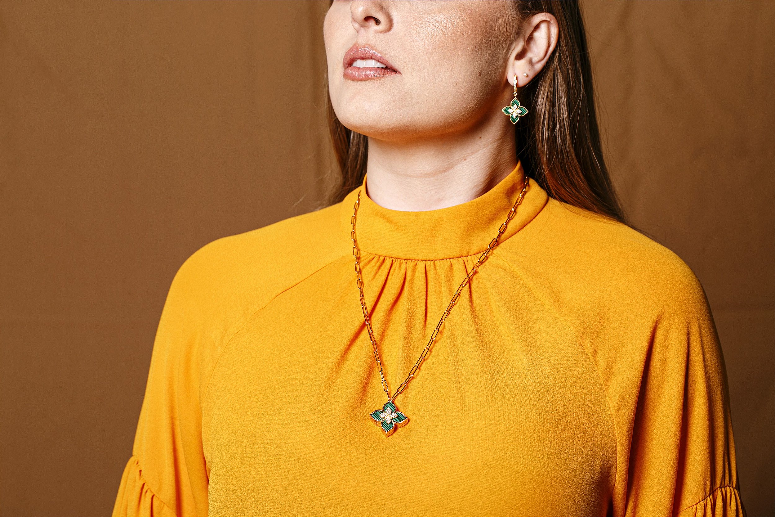 Linda corrente com elos retangulares e pingente que abre em formato floral de três pétala, em pedra natural Malaquita, além de detalhes nas pétalas com Microzircônias.