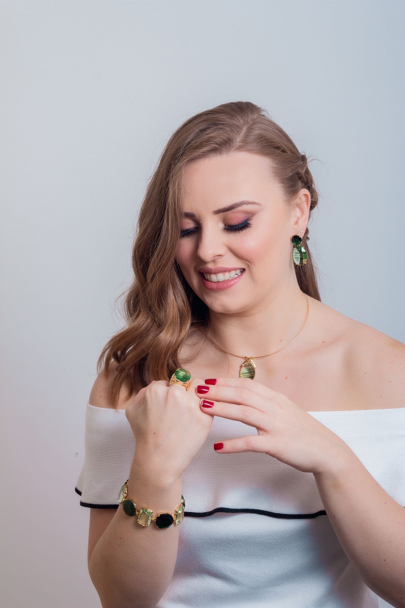 Conjunto de Gargantilha, Anel e Brincos finamente banhados a Ouro 18k com Cristais em tons de Verde.