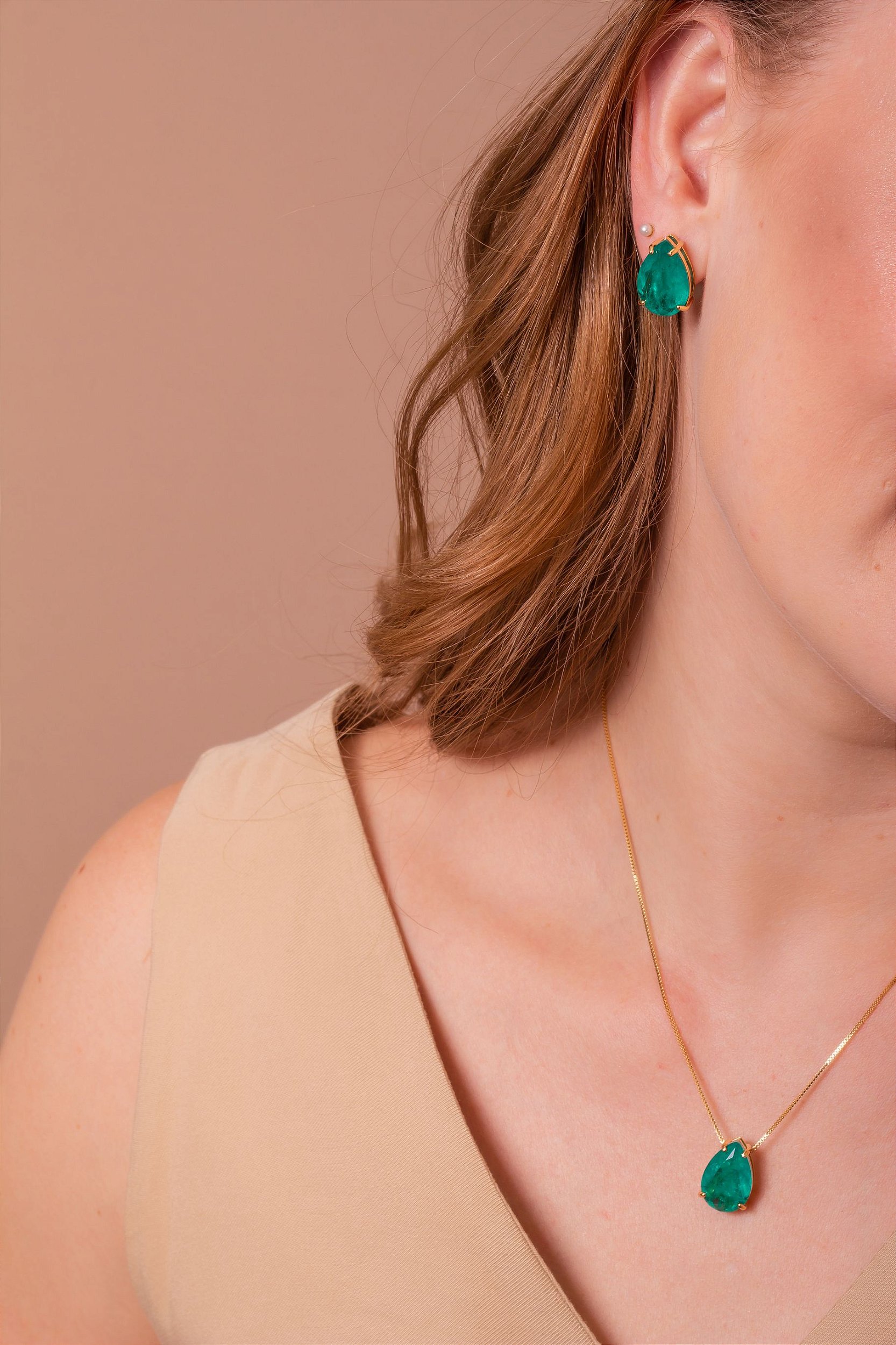Conjunto folheado a ouro 18k, com brinco e gargantilha. Brincos e pingente com Cristal Rutilado Verde Mar em formato de gota 18x12mm facetada.