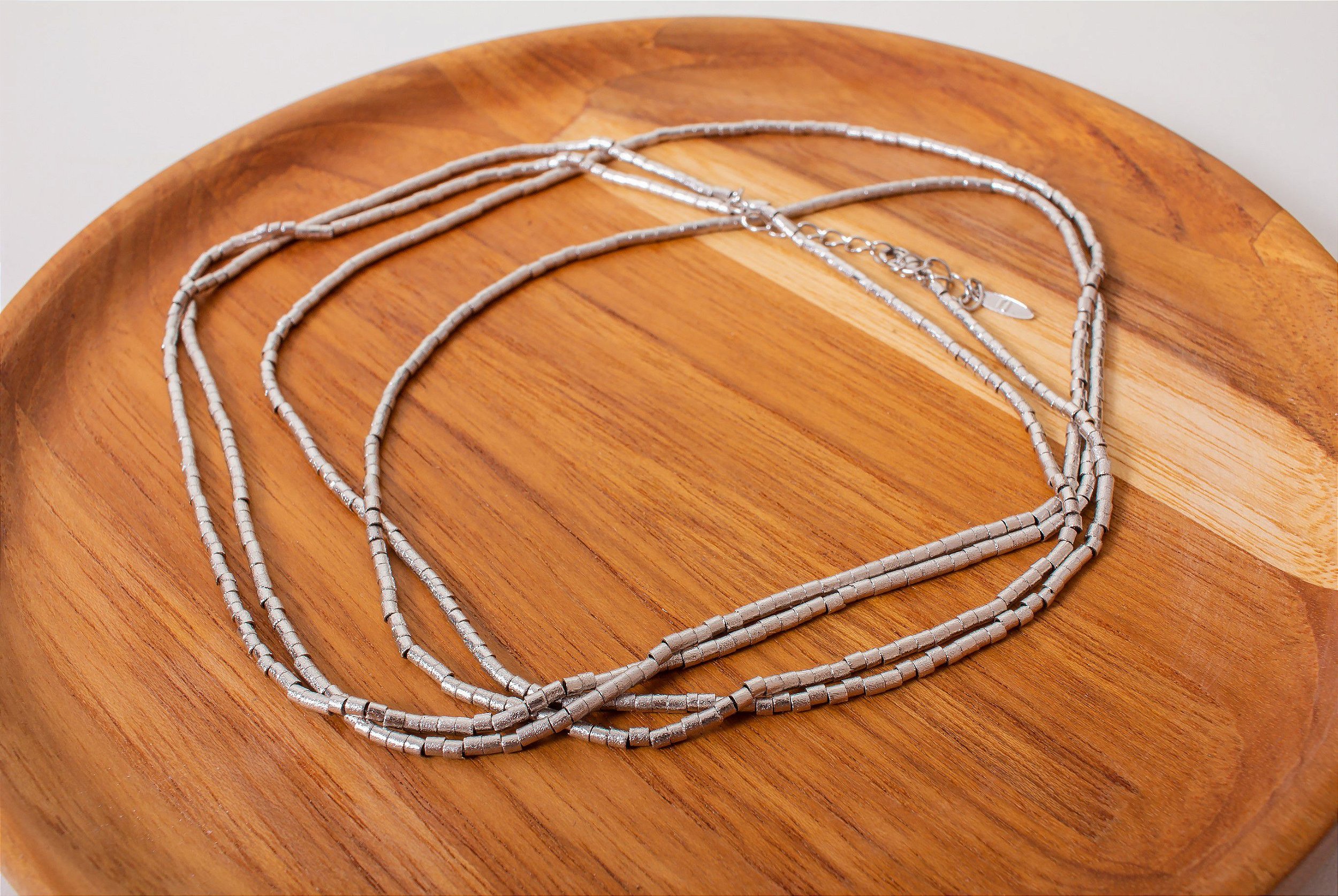 Corrente comprida, de 1,50m, cheia de canutilhos de Ródio Branco ao longo dela. Pelo seu tamanho, é possível dar várias voltas no pescoço ou deixar ela bem longa, você escolhe.