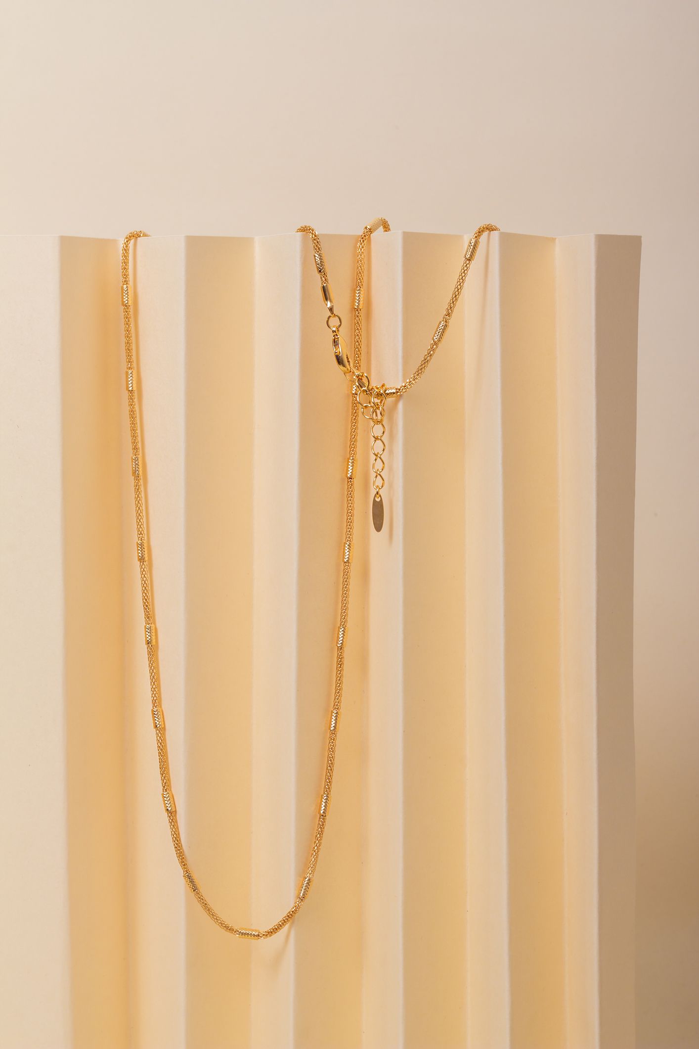 Corrente longa finamente banhada a Ouro 18k com faixas em corrente vazada e intercalada com pequenos canutilhos, também em ouro, em seu corpo.