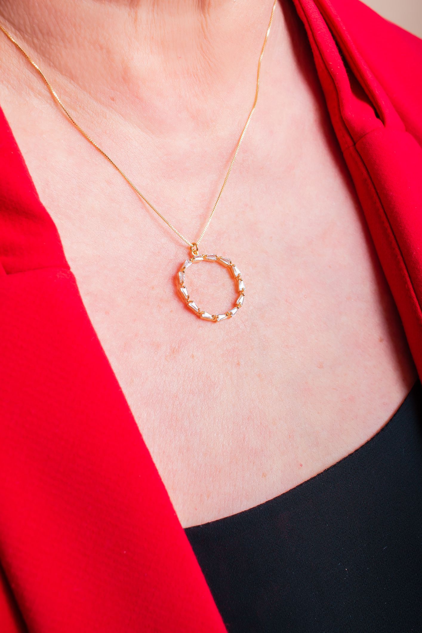 Gargantilha finíssima, finamente banhada a ouro 18k com um pingente em formato circular, no qual há uma linha de Zircônias em estilo trapezoidal.