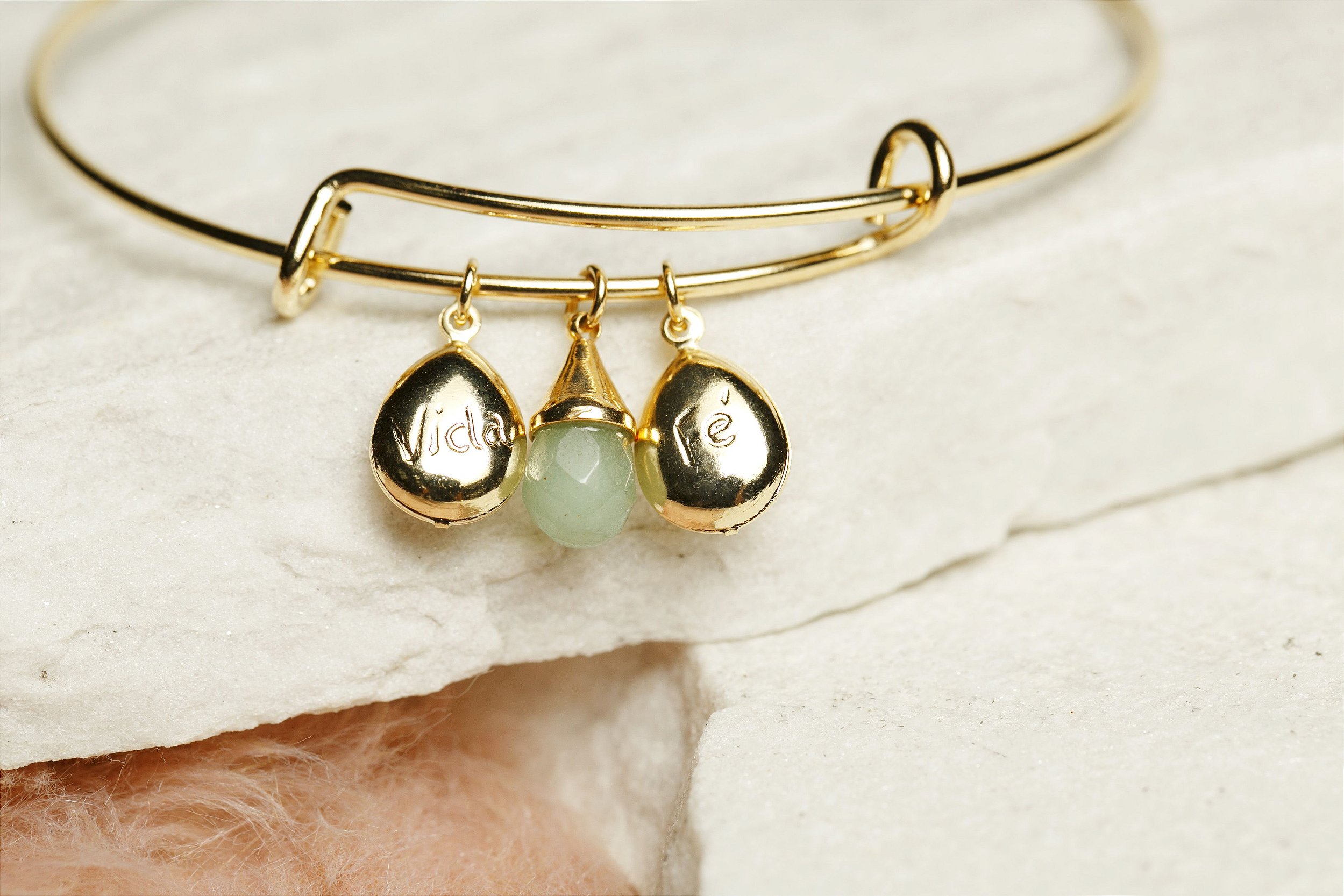 Linda pulseira tipo bracelete finamente banhada a Ouro 18k com lindos pingentes nos quais há as incrições: