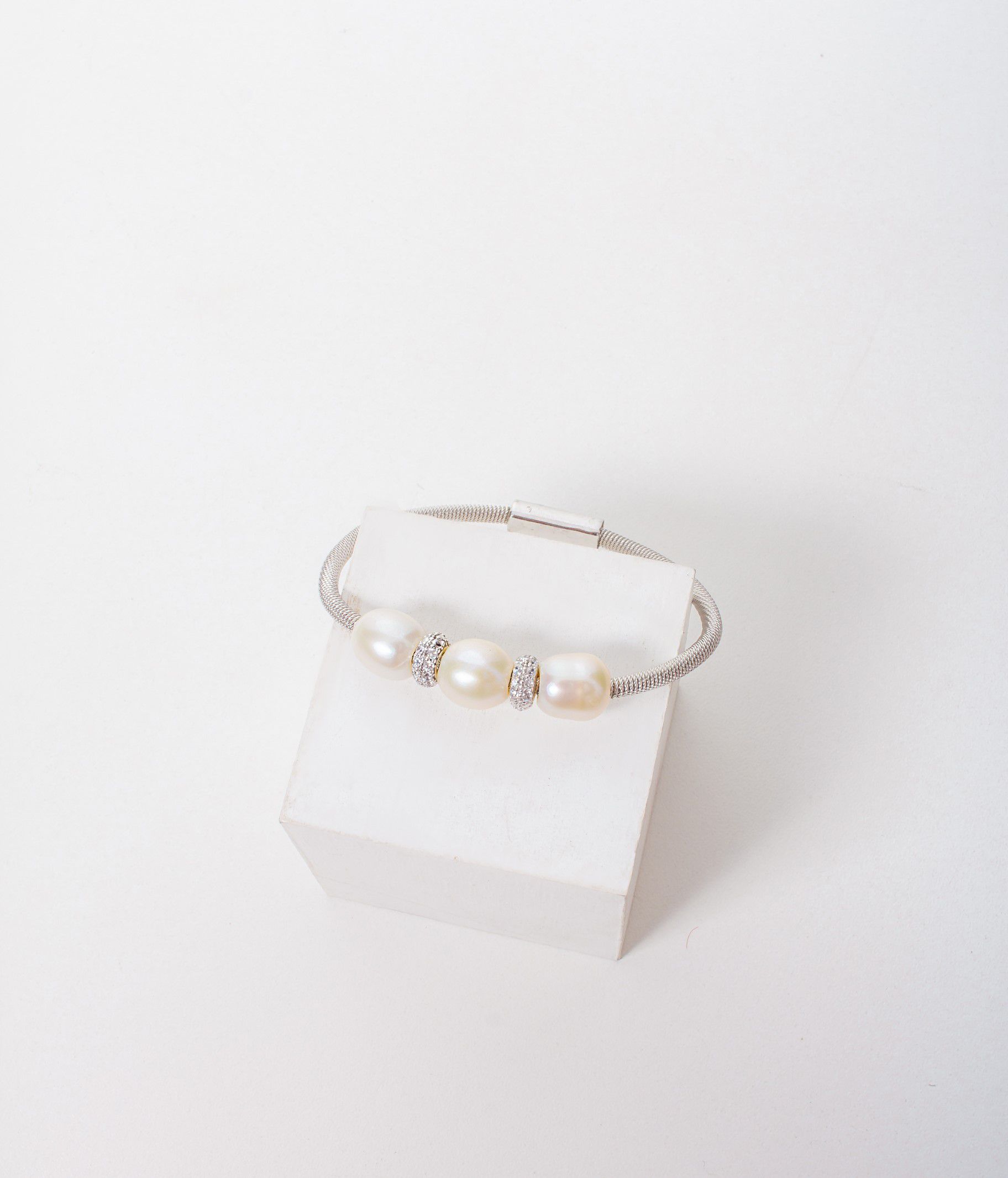 Pulseira de prata italiana com três Pérolas de 10x11mm aproximadamente intercaladas com detalhe em Microzircônias. A